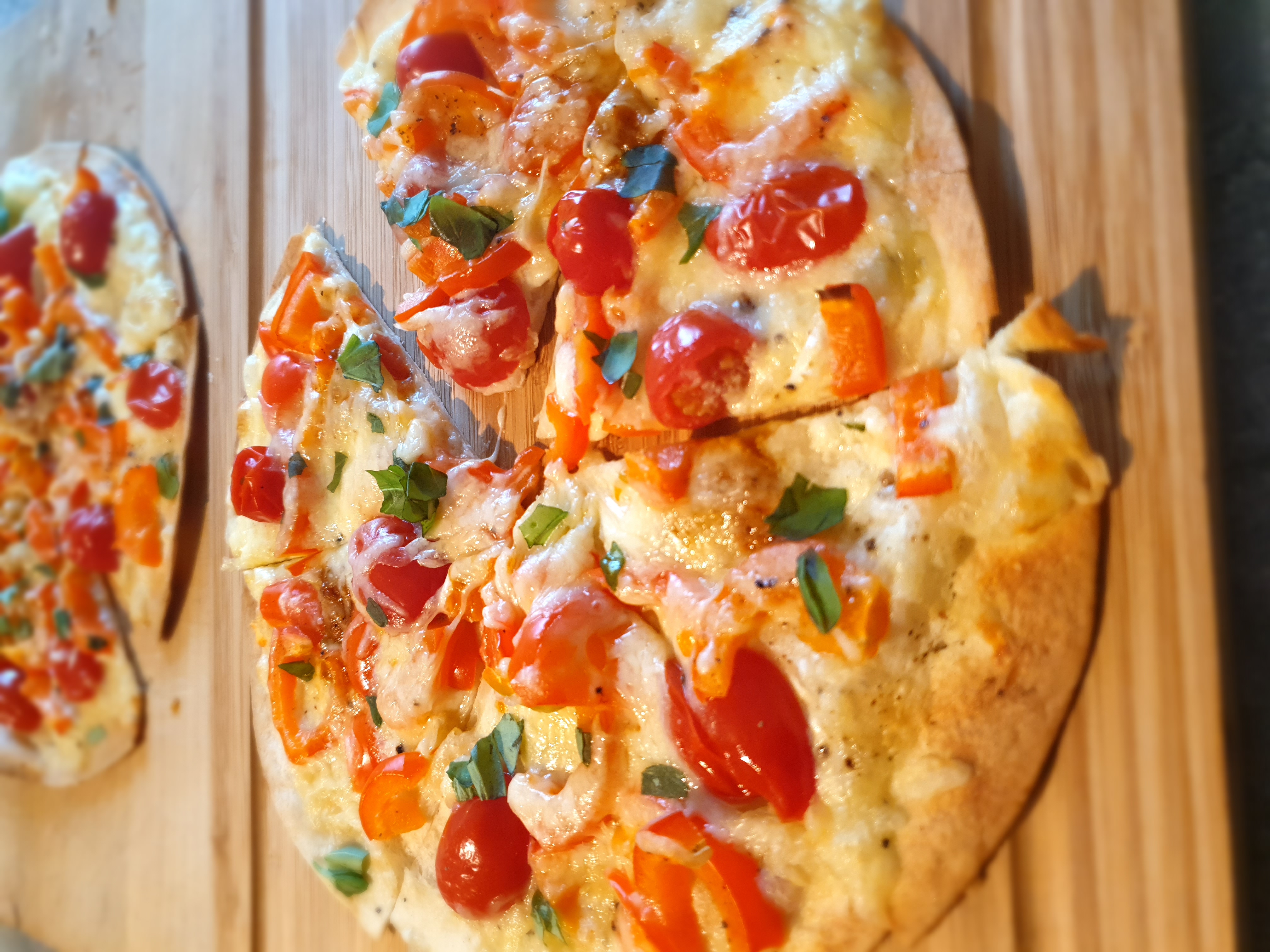 Die Tortillapizzen herausnehmen und mit klein gezuptem Basilikum bestreuen.